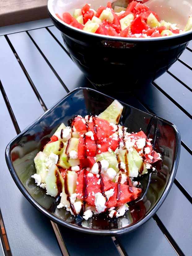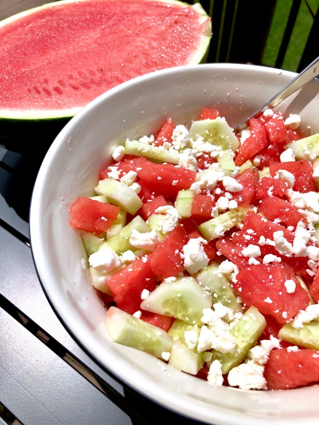 A few years ago I experimented with different summer salads including watermelon as a way to use up leftover chunks. The result of my experiment was a light, refreshing salad made from four simple ingredients – watermelon, cucumbers, feta cheese and balsamic glaze. Some of you may be questioning the feta cheese and balsamic glaze, but trust me – you can’t knock it until you try it!